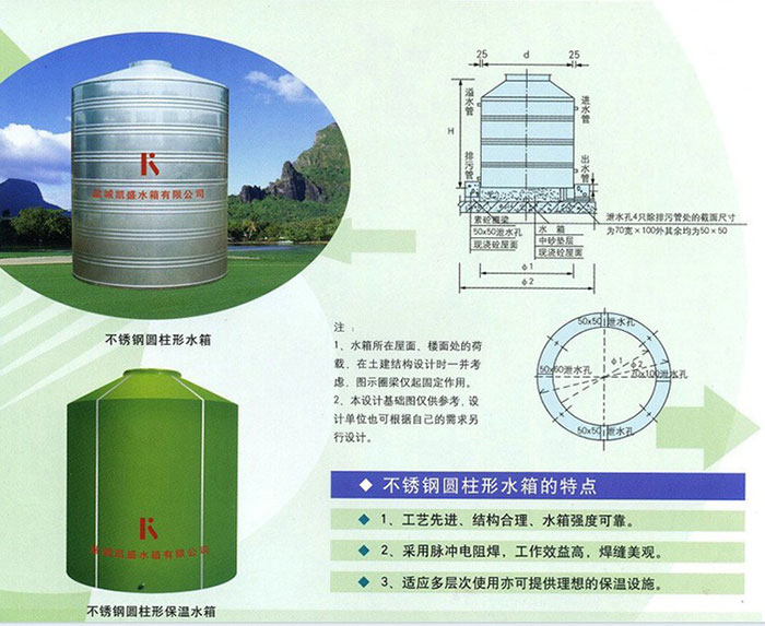 1、保溫不銹鋼圓柱水箱款式新穎、技術(shù)一流 由單元矩形式成型薄板任意拼裝焊接,線形流暢平直,具有鮮明的時代特征與明亮的金屬光澤。
